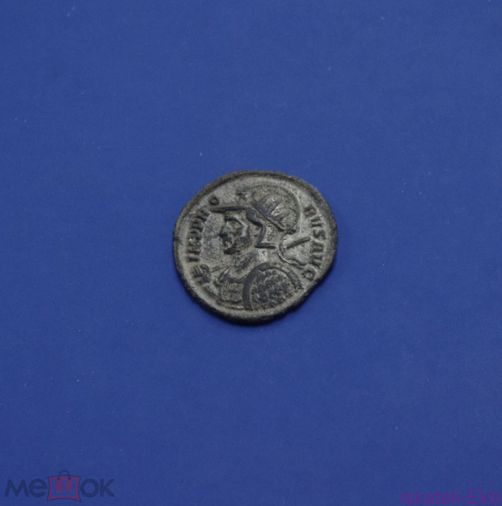 Аверс: Бюст императора в кавалерийских доспехах , на шлем надета лучевая корона,в правой руке держит копье,положив его на плечо,слево держит щит.