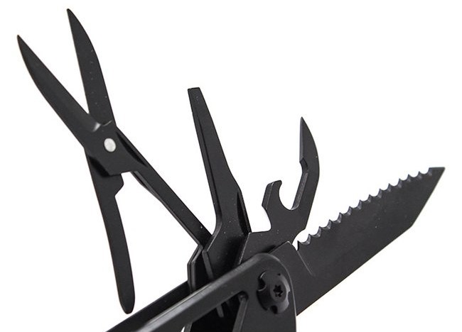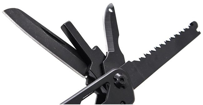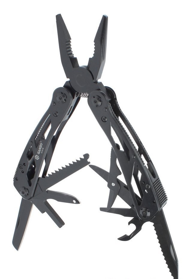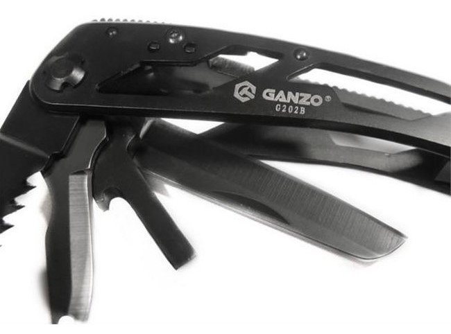 2. Количество инструментов - Ganzo G202-B объединяет 24 функций в одном устройстве: адаптер для бит, инструмент для снятия изоляции, комплект сменных бит, консервный нож, кусачки для проволоки, нож, нож-серрейтор, ножницы, отвертка плоская, открывалка для бутылок, пассатижи, переходник для бит, пила, приспособление для захвата гаек и цилиндров, шило, 11 бит.