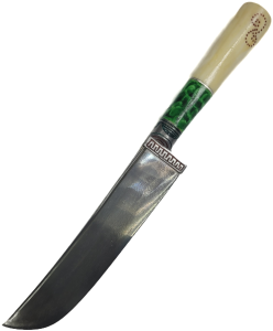 АН Пчак нож с фиксированным лезвием – кухонный нож в традиционном исполнении с рукоятью из стабилизированной березы и кости. Изысканный узбекский нож с широким клинком из высококачественной стали ШХ-15, украшенный рукоятью из стабилизированной карельской березы с элементами кости и художественным узором.