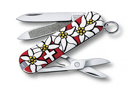Функционал "Edelweiss" 0.6203.840 насчитывает 7 пунктов. Среди инструментов данного набора: ножевое полотно, ножницы, плоская отвертка, пилка для ногтей, зубочистка и пинцет. Этот складной нож крепиться к связке ключей при помощи вмонтированного кольца.