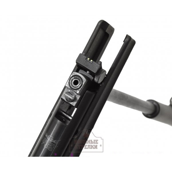 Нарезной ствол изготовлен из стали, ложе и приклад - из высокопрочного черного полимера. Источник энергии - витая пружина.