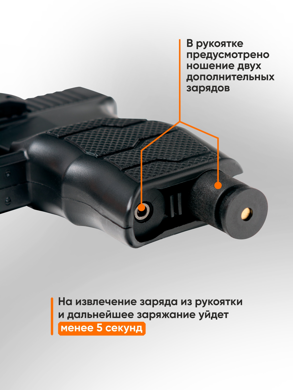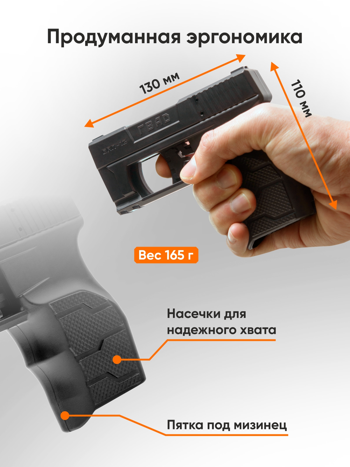 • Продуманная эргономика. Устройство имеет габариты 111×133×29 мм и вес 165 г. В рукоятке предусмотрено ношение двух дополнительных зарядов, а также на тыльной части есть антабка для установки страховочного тренчика. Надежный хват устройства обеспечивают насечки на рукоятке и «пятка» под мизинец.