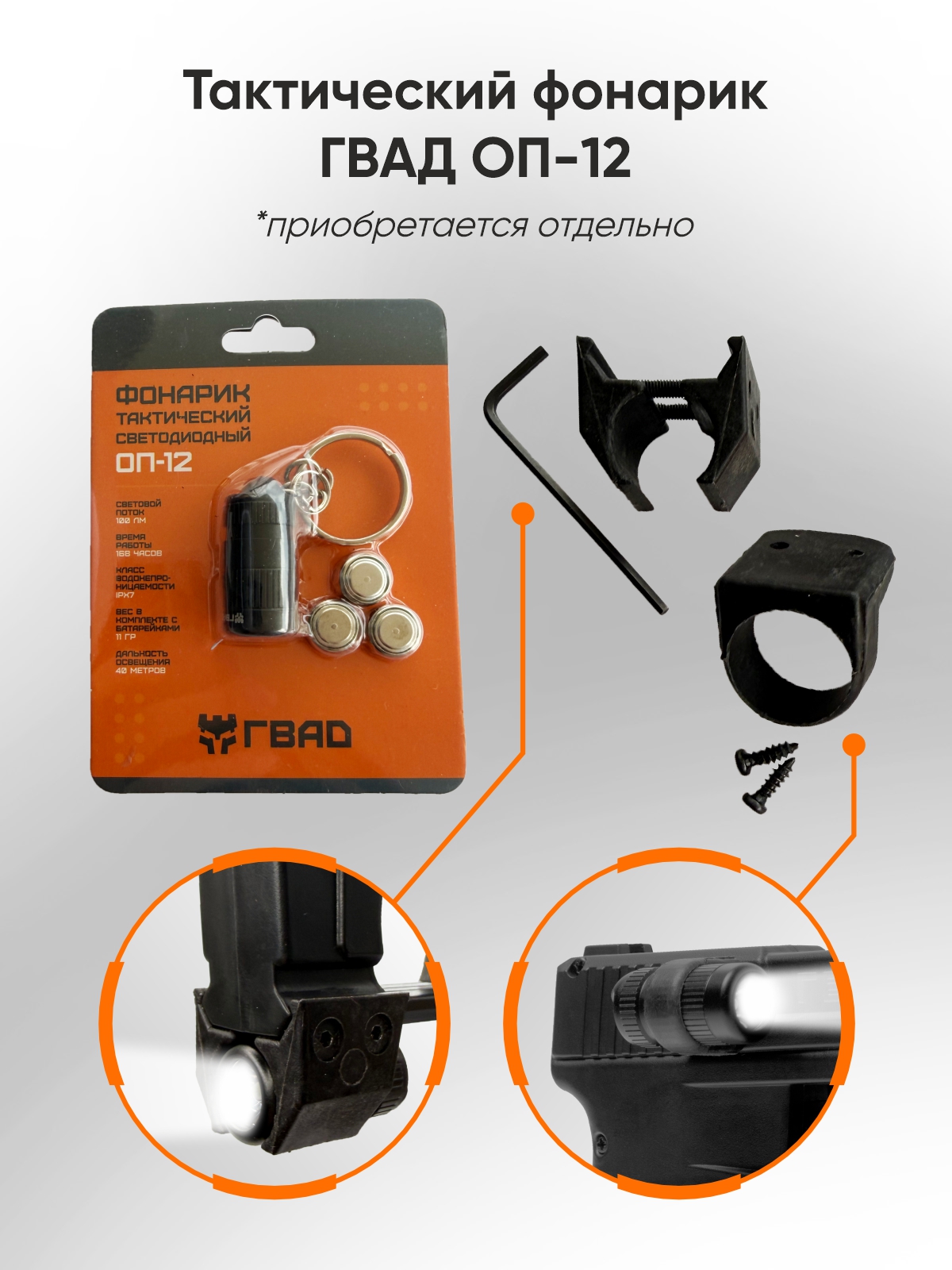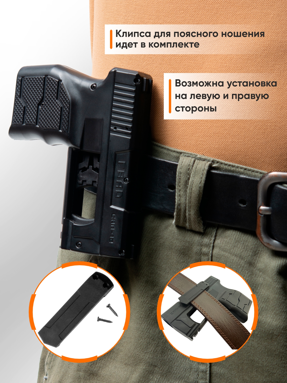 • Возможность установки тюнинга. В комплекте с устройством идёт клипса для поясного ношения, которую можно установить как на левую, так и на правую сторону. Есть планка Вивера для установки осветительных или прицельных приспособлений.