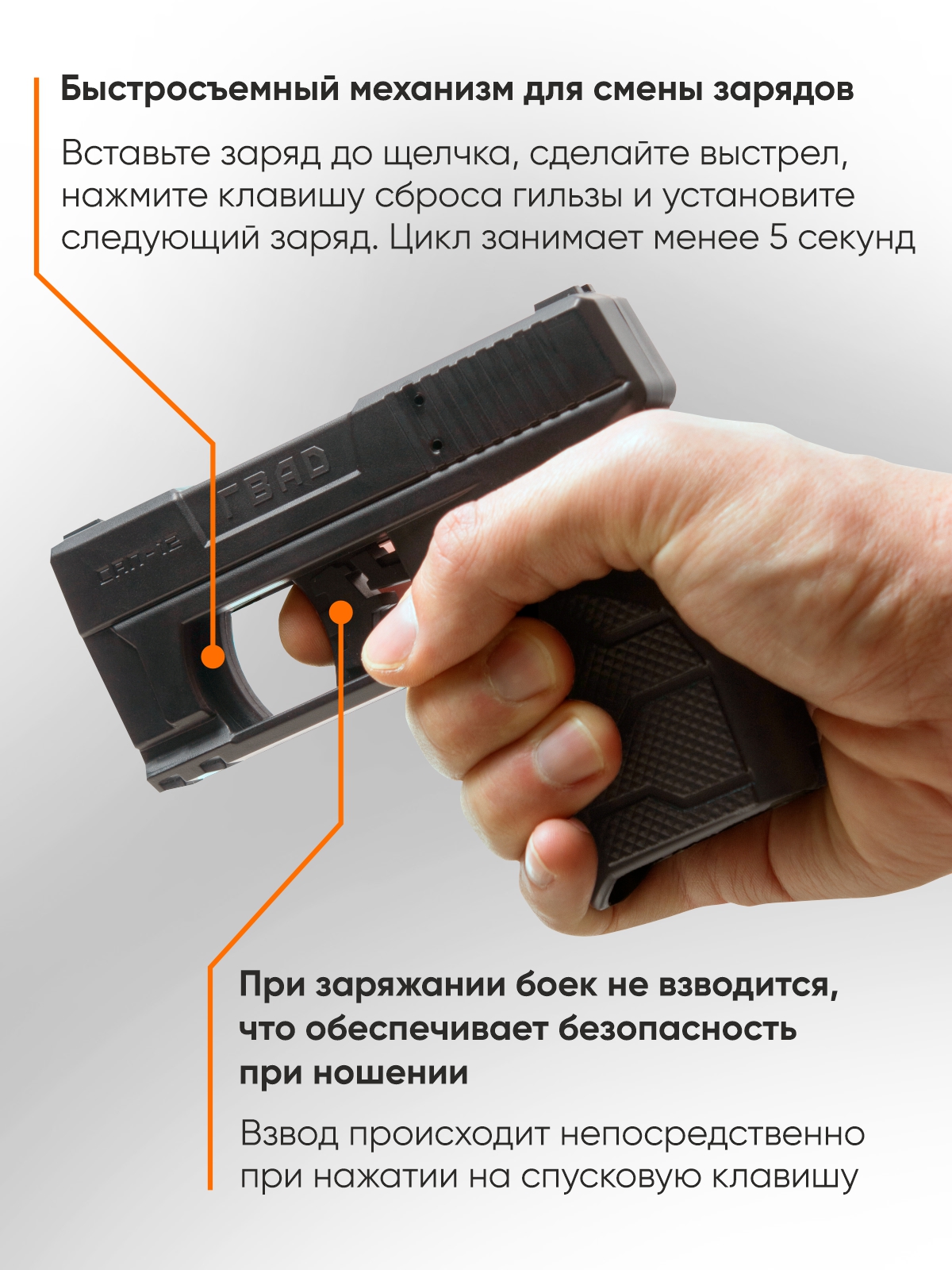 • Безопасность. При заряжании устройства боек не взводится. Это обеспечивает безопасное ношение: при падении устройства срабатывание исключено.