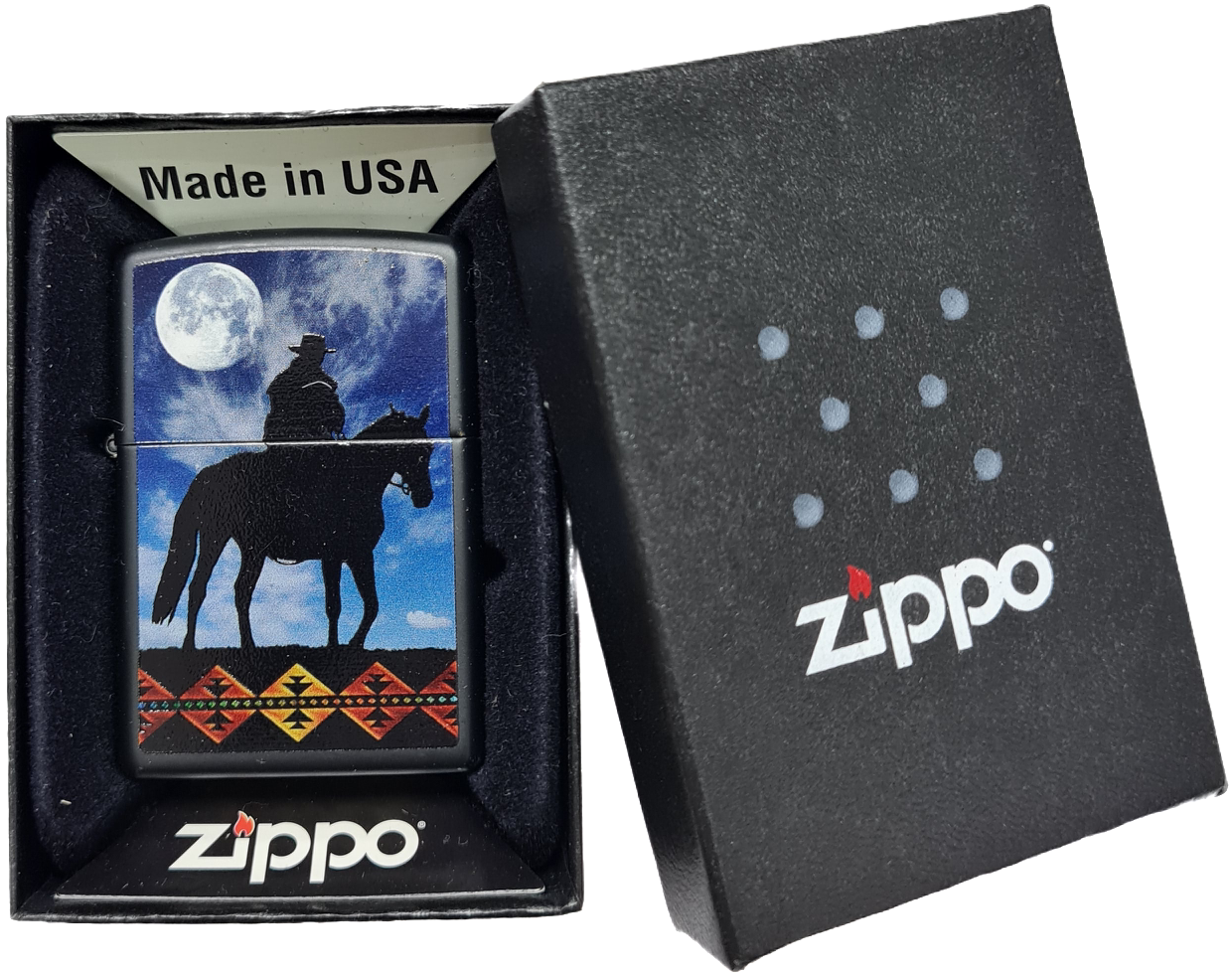 Zippo 28311 Cowboy Moon Black Matte — бензиновая зажигалка с атмосферным дизайном, вдохновлённым романтикой ковбойских приключений. На чёрном матовом фоне изображён всадник, мчащийся под полной луной — символ свободы и духа Дикого Запада. Латунный корпус с износостойким порошковым покрытием сочетает элегантность и практичность, а компактные размеры (36×56×12 мм) делают модель идеальным спутником в путешествиях.
