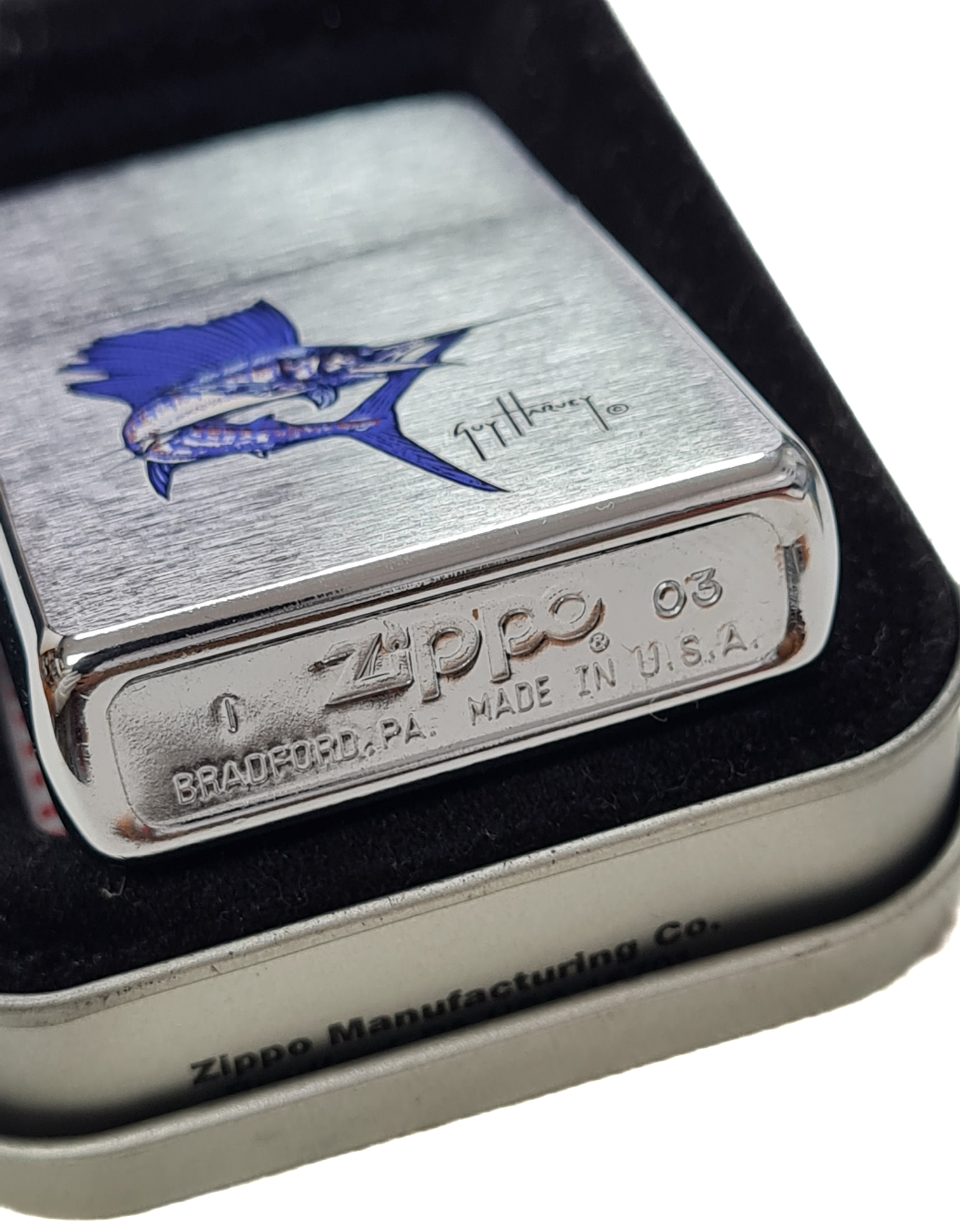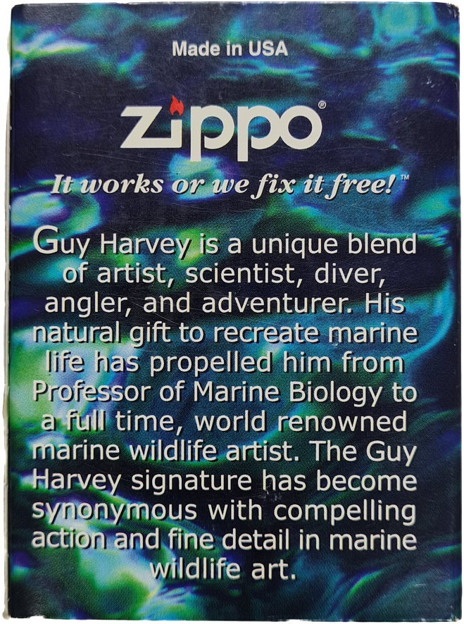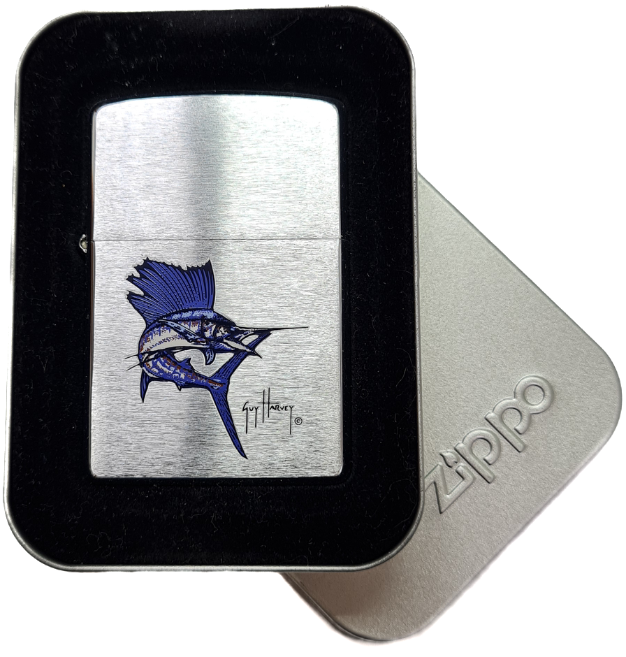 Zippo 200GH.201 Sailfish — эксклюзивная бензиновая зажигалка с дизайном от всемирно известного художника-мариниста Гая Харви. Модель украшена динамичным изображением рыбы-парусника, выполненным в фирменном стиле Харви: полупрозрачные мазки создают эффект движения волн, а контрастные акценты подчеркивают мощь океана. Корпус из латуни с покрытием Brushed Chrome сочетает элегантность и практичность. Лимитированная серия, идеальна для коллекционеров, яхтсменов и поклонников тактического стиля.